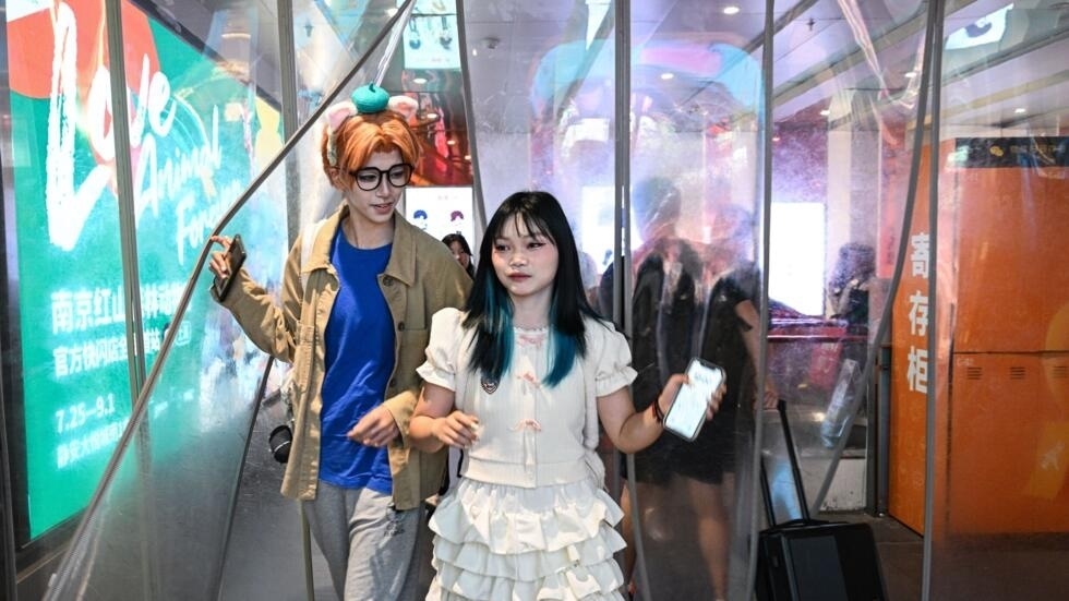 Cosplayer Xu Yunting (L), dressed as a male character from a video game, and Feng Xinyu at a shopping mall during their 'cos commissioning' date in Shanghai © Hector RETAMAL / AFP