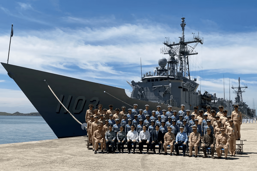 Taiwan's President Lai Ching-te poses for a group picture in front of the Taiwan warship Cheng Ho as he visits Magong navy base in Penghu islands, Taiwan September 6, 2024. REUTERS/Ben Blanchard