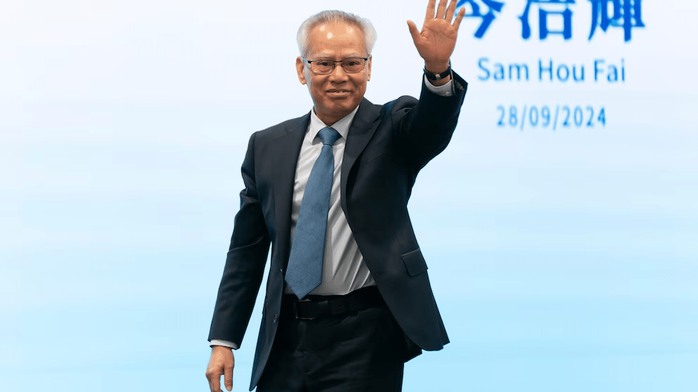 FILE The sole candidate for the upcoming election for the Macao chief executive post, Sam Hou Fai, the city's former top judge, waves as he leaves the stage after a press conference at the China-Portuguese-speaking Countries Commercial and Trade Service Platform Complex in Macao, Saturday, Sept. 28, 2024. (AP Photo/Anthony Kwan, File)