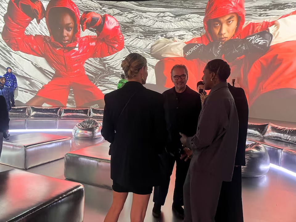 U.S. rapper ASAP Rocky speaks with Moncler CEO Remo Ruffini during a media preview of the Moncler Genius 'The City of Genius' show in Shanghai, China October 19, 2024. (Reuters)