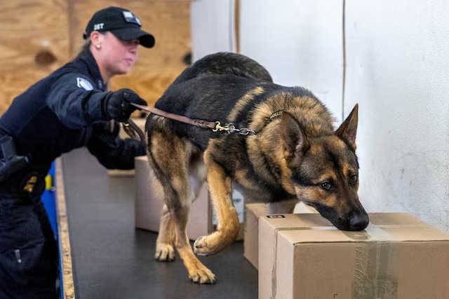 Kristen Ingram, a U.S. Customs and Border Protection officer, trains Soyer to detect narcotics in a simulated mail room, at a government training facility for drug-sniffing dogs who work to combat the transit of fentanyl and other drugs, in Front Royal, Virginia, U.S., June 18, 2024. REUTERS/Evelyn Hockstein/File Photo