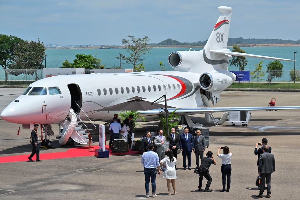 People stand near the Dassault Falcon 8X on display at the inaugural edition of Business Aviation Asia Forum and Expo 2025 (BAAFEx) held at Changi Exhibition Centre in Singapore March 4, 2025. REUTERS/Caroline Chia/File Photo
