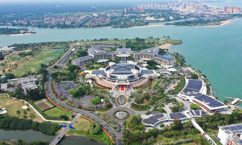 As the sea breeze flows over the permanent site of the annual conference of the Boao Forum for Asia, the photovoltaic array radiates a gentle glow, and flower-shaped wind turbines spin, generating green electricity for nearby buildings.