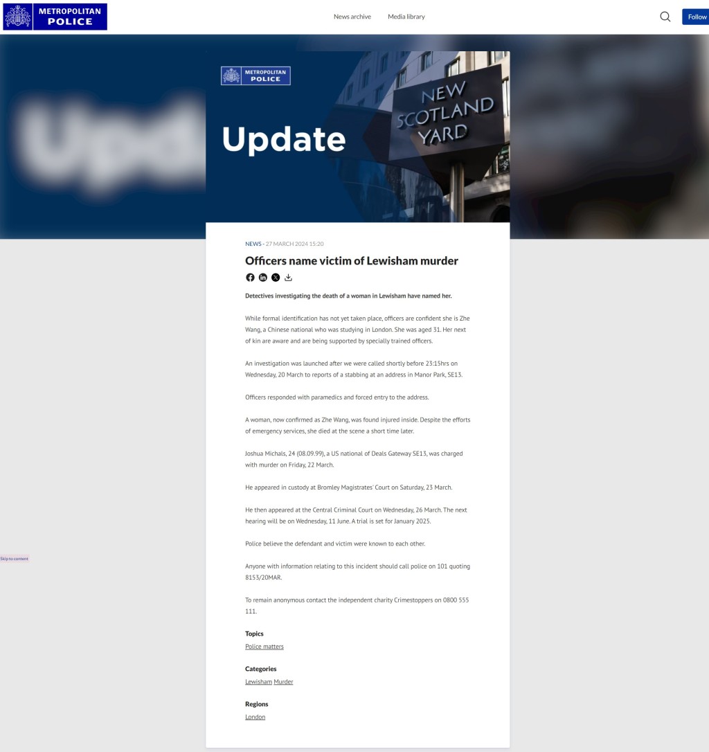 It is reported that Joshua Michals, a film major, killed a fellow Goldsmiths, University of London student, Wang Zhe, at her flat in Lewisham in March 2024.