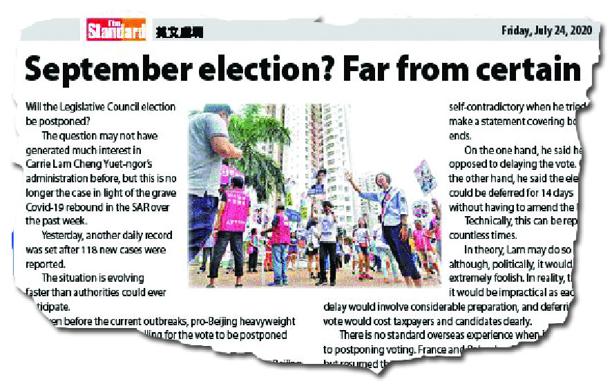 Former Legco president Jasper Tsang Yok-sing was hardly the first person to suggest postponing the election - which is still scheduled for September 6 - but he was the first pro-Beijing heavyweight to propose putting off the vote for a year. And the administration obviously sees merit in his advice.