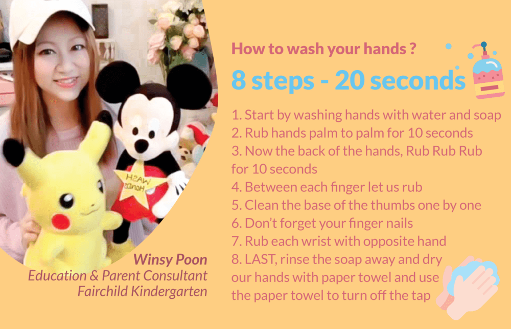 At this critical time, Fairchild Kindergarten shares a positive message and supports the community by providing a variety of useful educational materials on preventing the COVID-19 virus. The materials created by Winsy Poon, Education and Parents Consultant of Fairchild Kindergarten, focus on three main themes, viz, ways to protect oneself from getting sick; the importance of washing hands; and hand washing in 8 steps