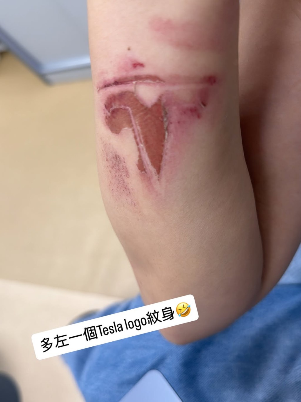 Photos showed her white Tesla with significant right-front damage after hitting the curb. Another image revealed a serious T-shaped injury on her left arm where large skin areas were scraped away, which she humorously described as "gaining a Tesla tattoo." A hospital video captured the distressed host crying alone while masked, expressing fear after the traumatic incident.
