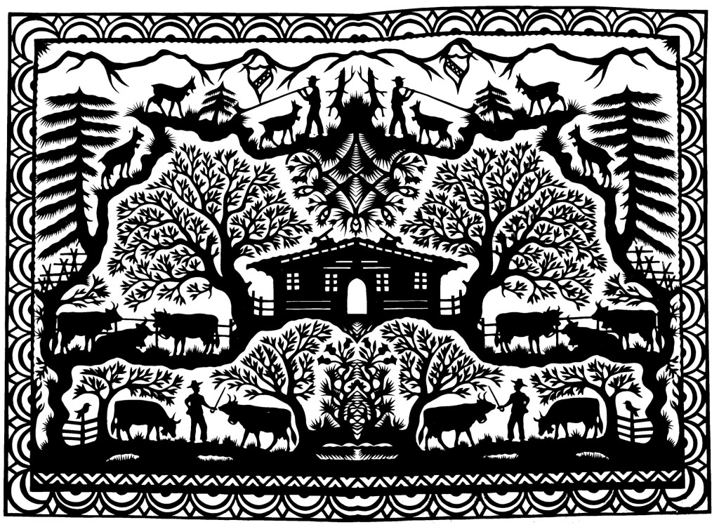 Swiss paper cuttings are primarily narrative works. From the mid-19th century onwards, they replaced the popular shadow pictures known as silhouettes, with a particular focus on Alpine life.