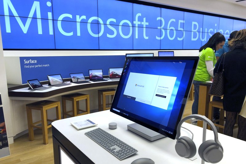 A Microsoft computer is among items displayed at a Microsoft store in suburban Boston.