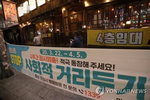 A street banner in the Hongdae neighborhood of western Seoul urges people to maintain social distancing to prevent the spread of the novel coronavirus, on April 21, 2020. The Hongdae area is famous for its youthful atmosphere.