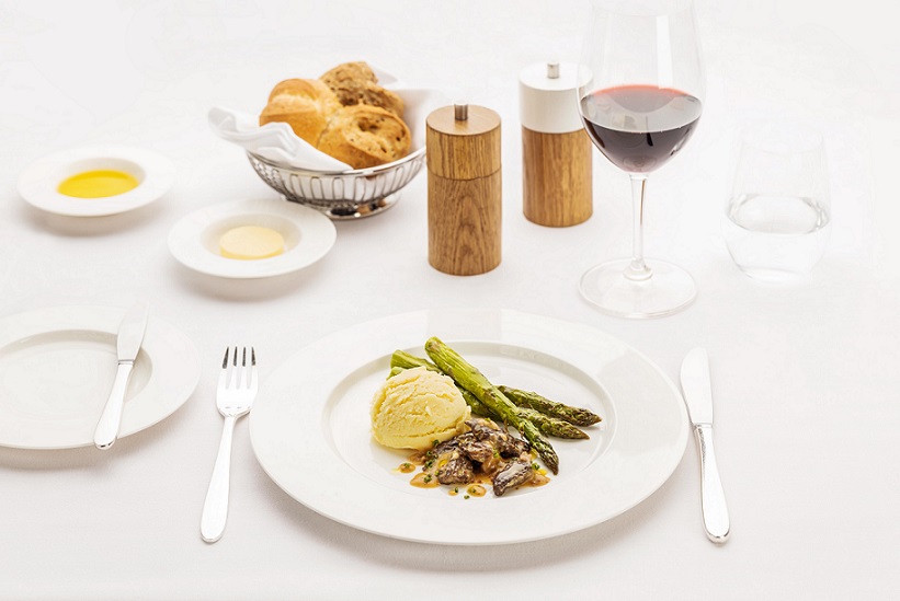 In Business Class, the first course is a salmon trout terrine with yoghurt mousse and pumpernickel. The main course is a choice of sautéed beef fillet with wild garlic demi-glace or poached chicken breast with tomato and mushroom ragout sauce. And for dessert there is a chocolate and spelt panna cotta with millet and apple crumble.