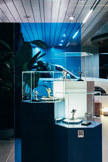 Six figurines of the Spirit of Ecstasy in different styles made from silver-plated, solid silver, dark-chromed, 9-carat gold-plated, rose gold and carbon fibre, invite visitors to indulge in the luxury world of Rolls-Royce.