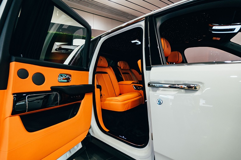 The Jubilee silver body with Turchese interior highlights its elegance, while the signature travel bags from the luggage collection underline the spontaneous and polished lifestyle of Rolls Royce owners. The boot of the impressive Rolls-Royce Cullinan in Artic White exterior serves as a viewing suite of a mini theater at which one can enjoy the views around the world projected on the screen. Next to the theater, an artpiece formed by the exquisite Rolls-Royce umbrellas crafted by Italian artisans demonstrates the luxury promised by Rolls-Royce regardless of weather and destination.
