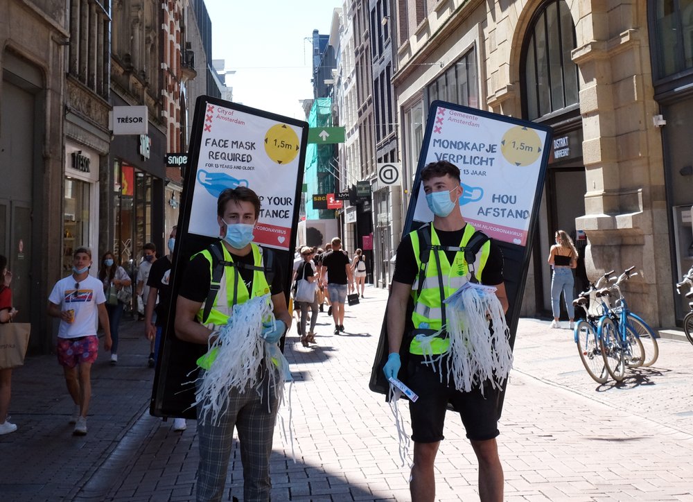 Face masks are offered to people in Amsterdam, Wednesday August 5.