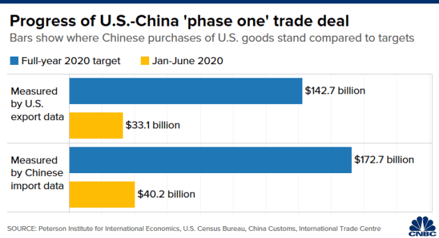In the first six months of this year, China’s purchase of the agreed products totaled less than a quarter of the amount targeted for the whole of 2020, data compiled by think tank Peterson Institute for International Economics showed.