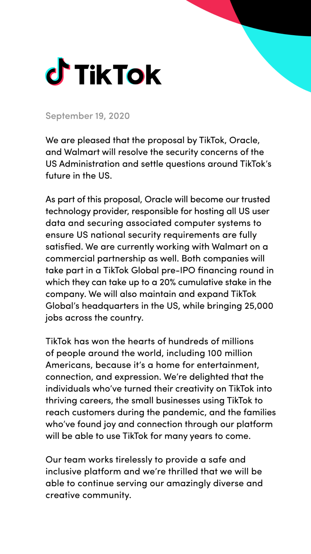 TikTok said it will maintain and expand its headquarters in the U.S., while bringing 25,000 jobs across the country. Trump had said a new company will likely be incorporated in Texas.