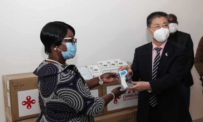 Chinese Ambassador to Zambia Li Jie, right, hands over medical supplies to Zambia's First Lady during the donation ceremony for medical supplies in Lusaka, capital of Zambia, on July 14, 2020.