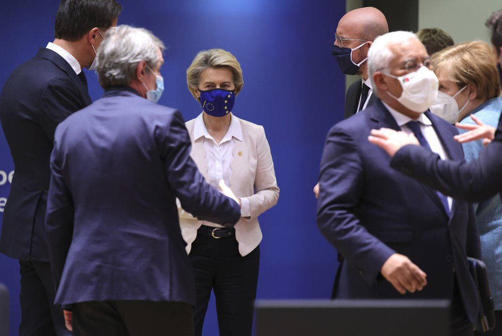 European Commission President Ursula von der Leyen, center, speaks with Dutch Prime Minister Mark Rutte, left, during a round table meeting at an EU summit in Brussels, Thursday, December. 10.