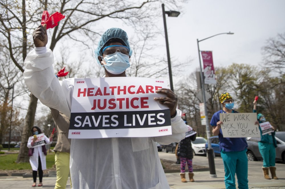 In this April 17, 2020, file photo, nurses demonstrate outside Jacobi Medical Center in New York, while protesting a new hospital policy requiring a doctor's note for paid sick leave. New laws are going into effect in 2021 in New York, one of 15 states with a paid sick leave law.