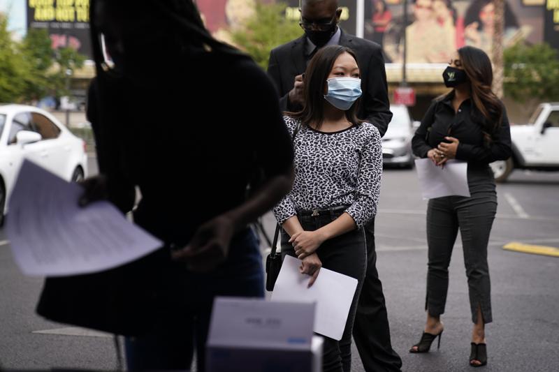 People wait in line, resumes in hand, while waiting to apply for jobs during an outdoor hiring event for the Circa resort and casino, Tuesday, April 27, 2021, in Las Vegas.