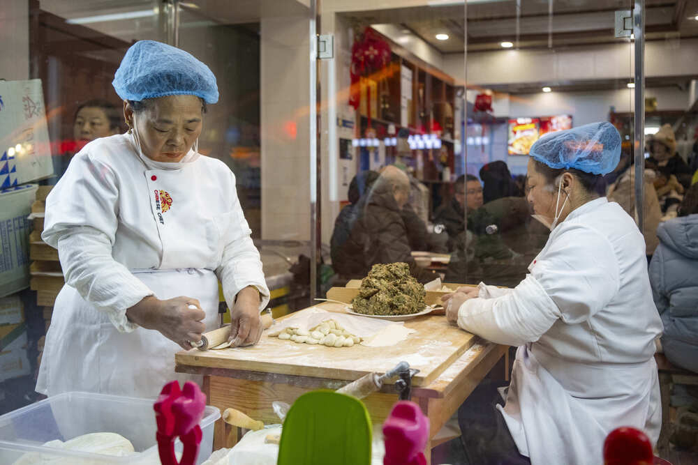 Staff members make dumplings at a restaurant at China's 'Snow Town' scenic spot in Mudanjiang, northeast China's Heilongjiang Province, Jan. 24, 2025. XINHUA