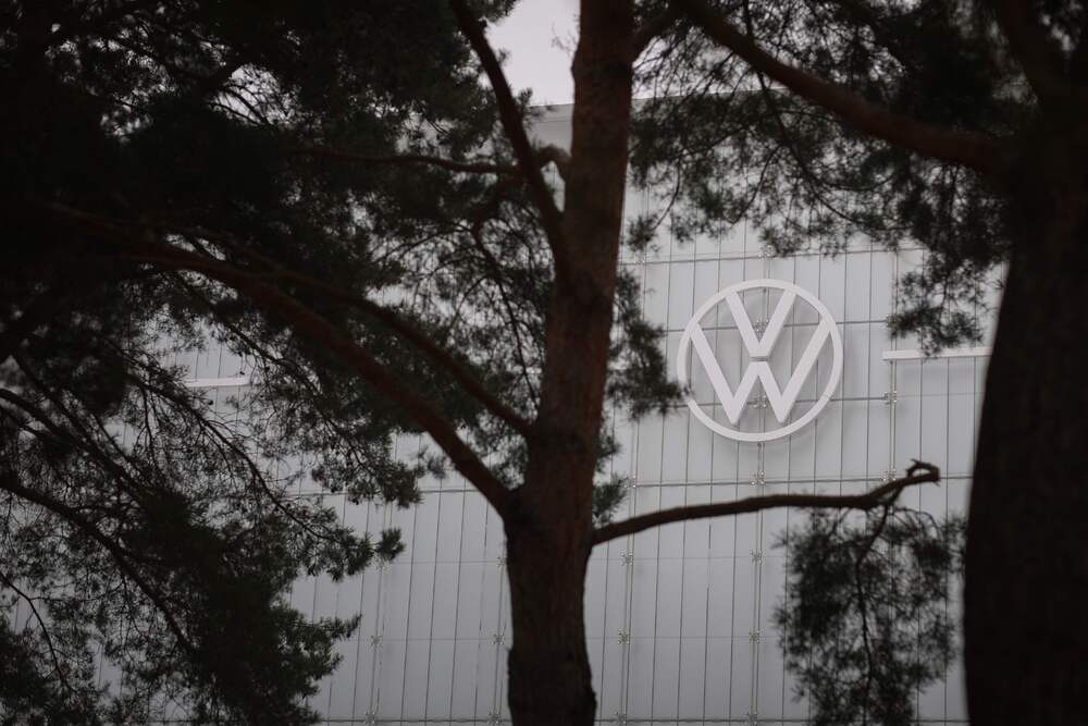The VW Logo is pictured during misty weather at the headquarters of German carmaker Volkswagen (VW) in Wolfsburg, central Germany, on March 11, 2025. (Photo by Ronny HARTMANN / AFP)