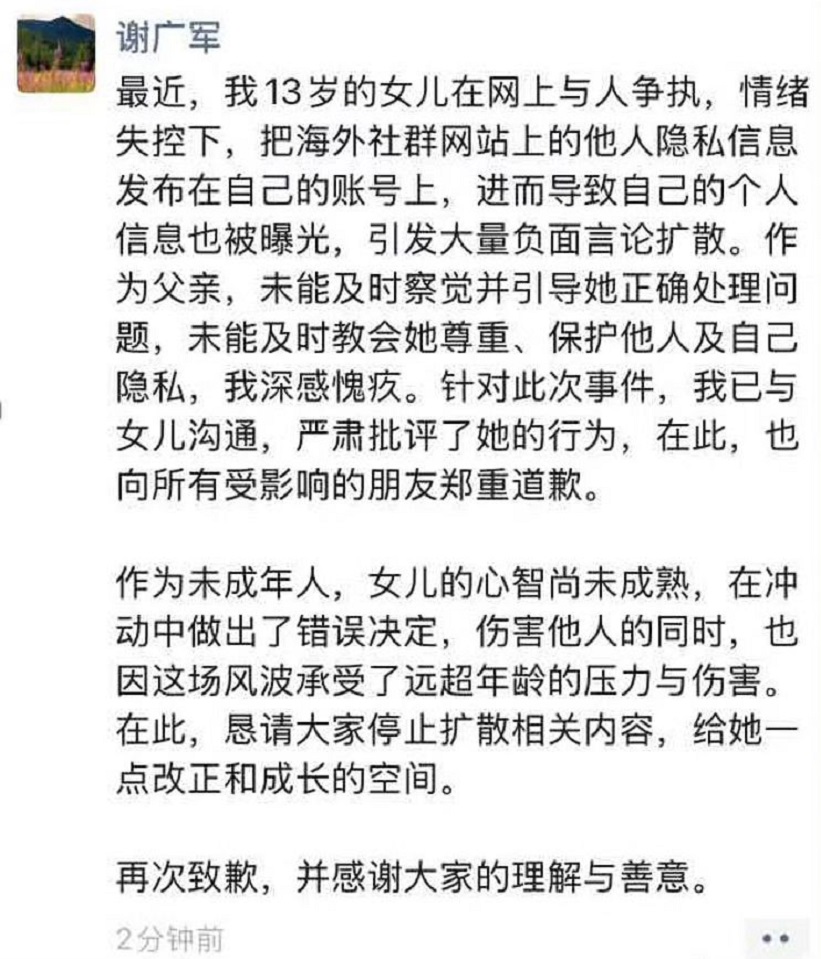 In a post on Tencent's (0700) WeChat, Xie said his daughter did so after "losing control during an argument online" and that he takes responsibility for failing to teach her the importance of privacy.