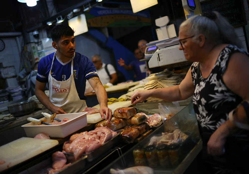 A butcher talks to a costumer in a local market, as Argentines ate more poultry per capita than beef in 2024. In Buenos Aires, Argentina January 23, 2025. REUTERS/Agustin Marcarian