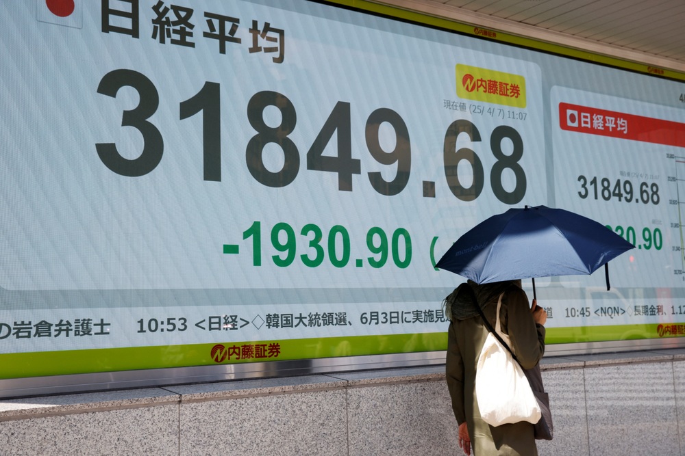 A man walks past a stock quotation board at a brokerage in Tokyo, Japan, April 7, 2025. REUTERS