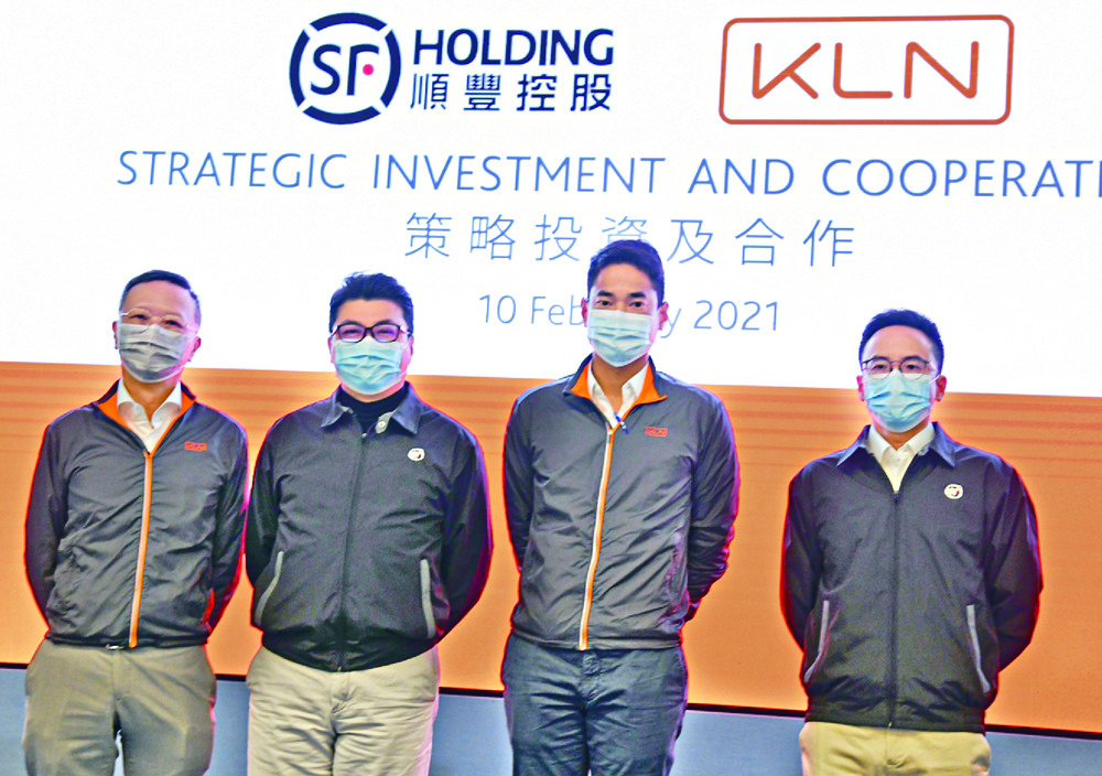 Announcing the deal are, from left, Kerry Logistics CEO William Ma, SF Holding chairman Dick Wang Wei, Kerry Logistics chairman Kwok Khoon-hua and SF Holding chief strategy officer Chen Fei. SING TAO