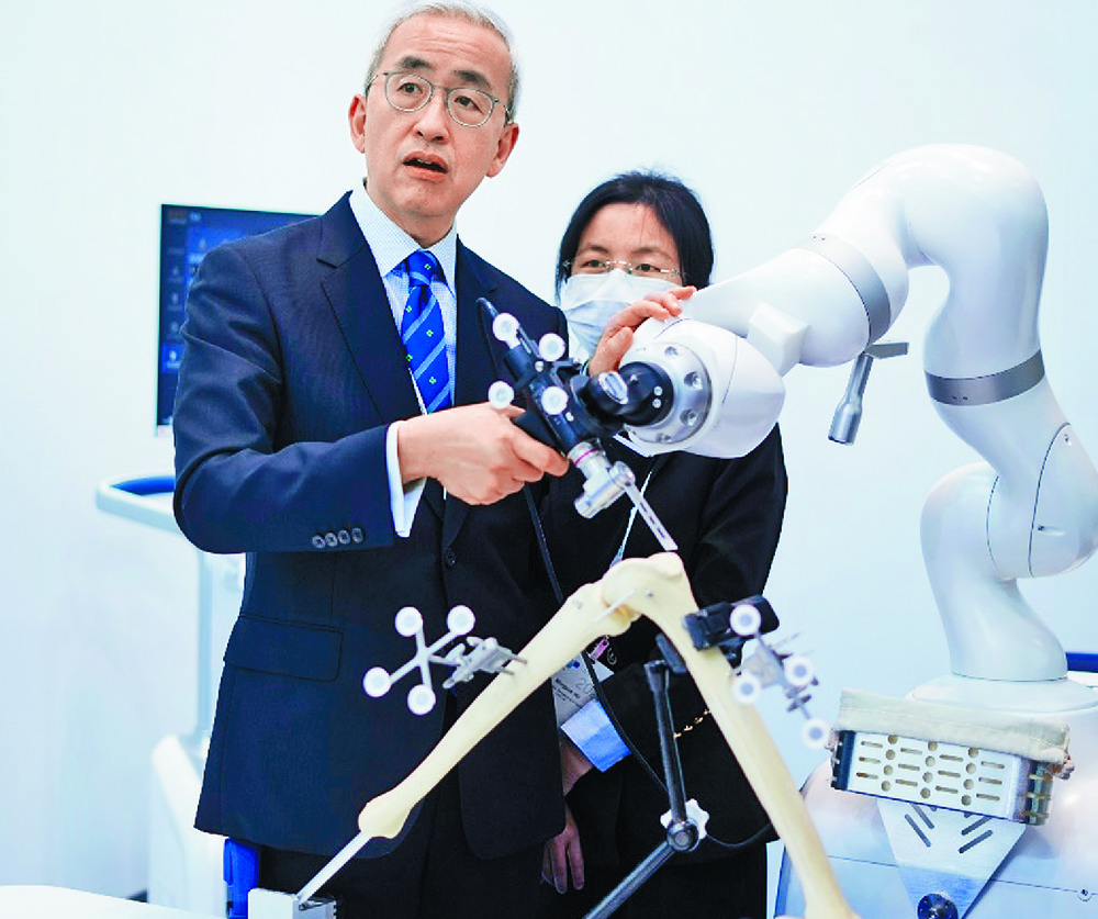 University of Hong Kong-Shenzhen Hospital director professor Kenneth Cheung tries out the surgical robot.
