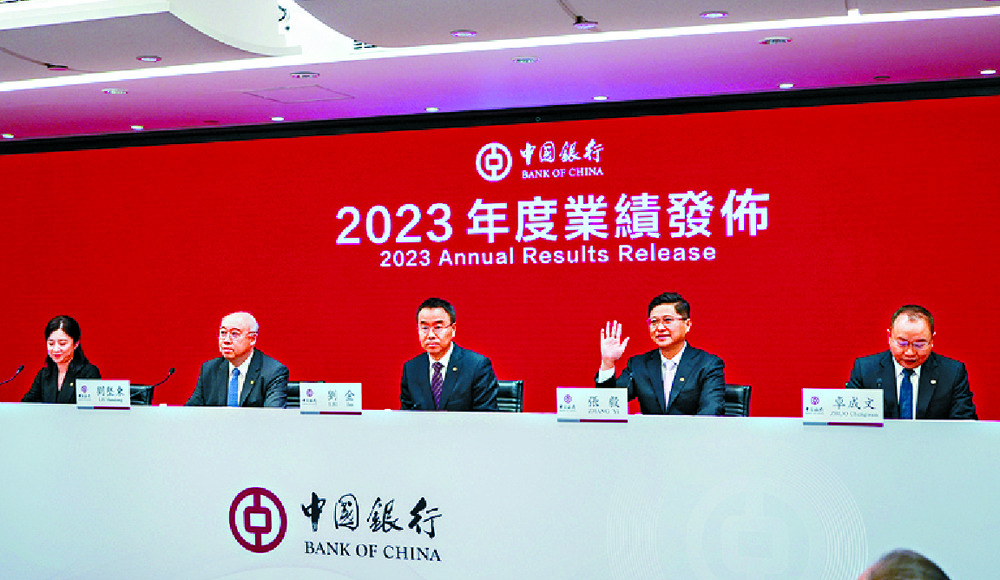 BOC president Liu Jin, center, Zhang Yi, second right, and other executives announce the results. Sing Tao