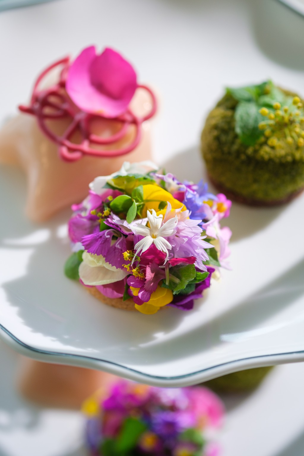 Standouts include the Mini Flower Tart, a vibrant composition of edible blooms, and the Almond and Rose Hinoki, a subtly fragrant dessert that brings delight to your tastebuds.
