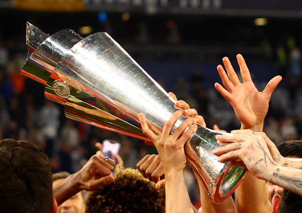 Portugal's Cristiano Ronaldo lifts the trophy as he celebrates with teammates after winning the Nations League. (Reuters)