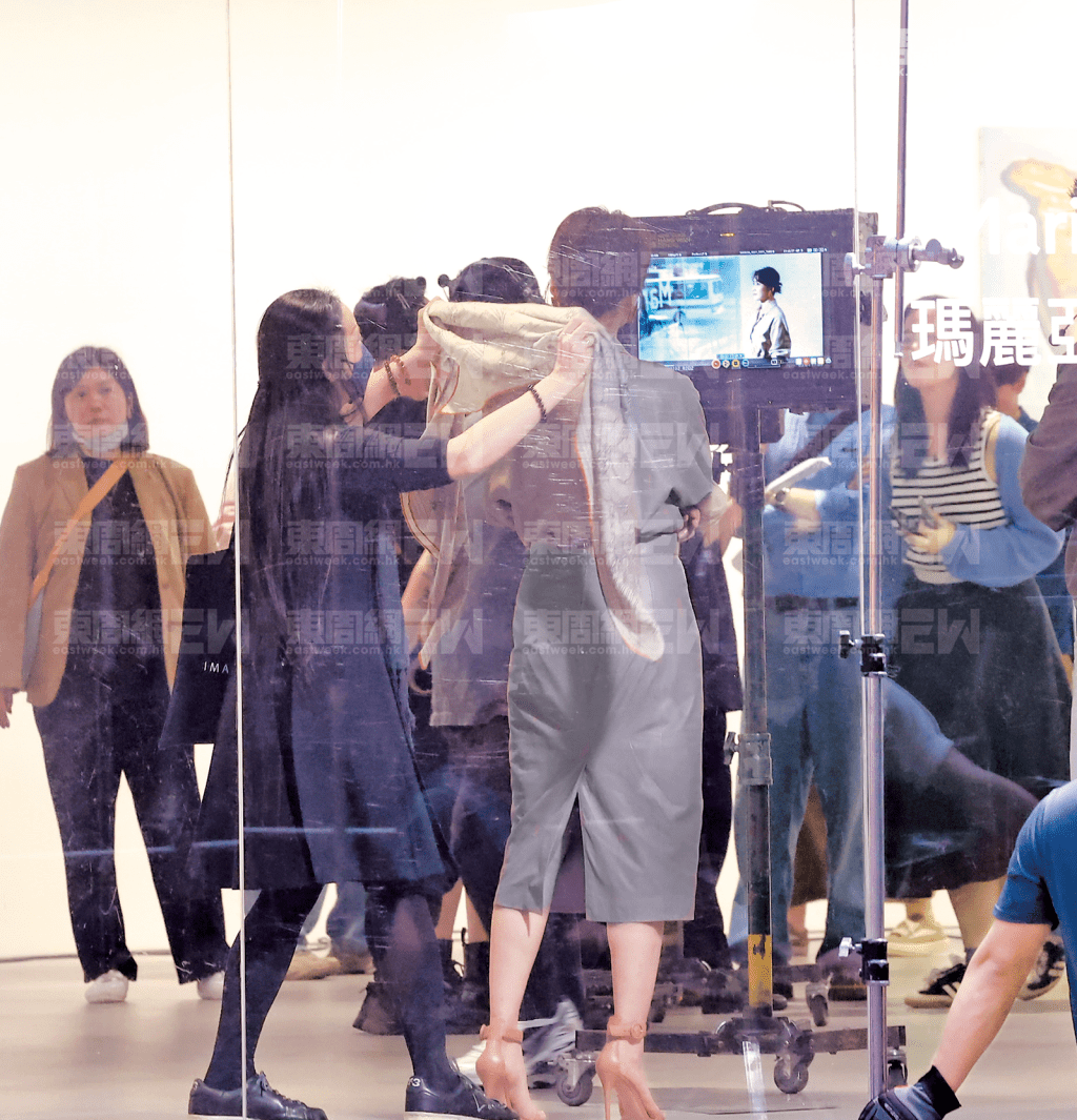 Off-camera, a full production team stood ready, with assistants stepping in as filming paused and stylists quickly refreshing her look. Despite the attention, Lai remained approachable, occasionally stepping out from a private resting area to chat and laugh with staff.