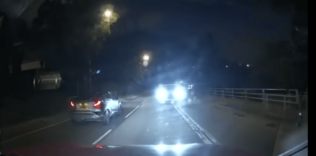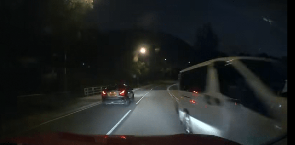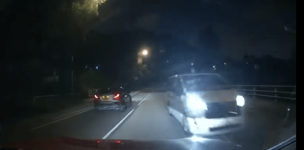 A van crossing into the opposite lane on Tai Po Road nearly caused a head-on collision with a taxi on Wednesday evening, with dashcam footage capturing the close call.