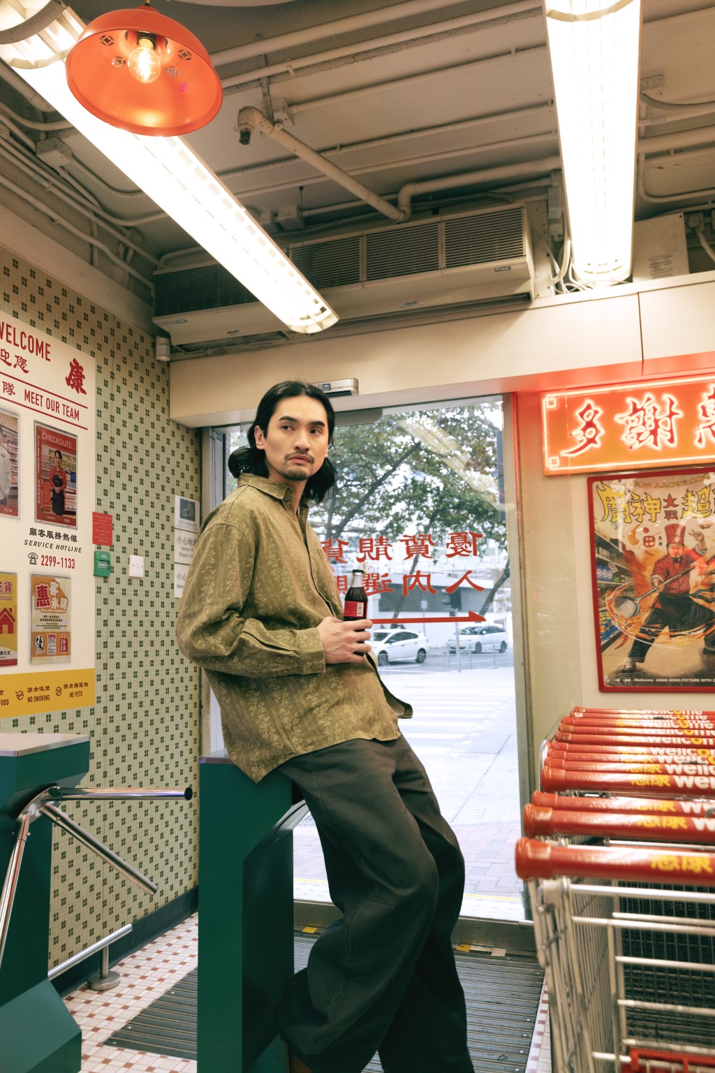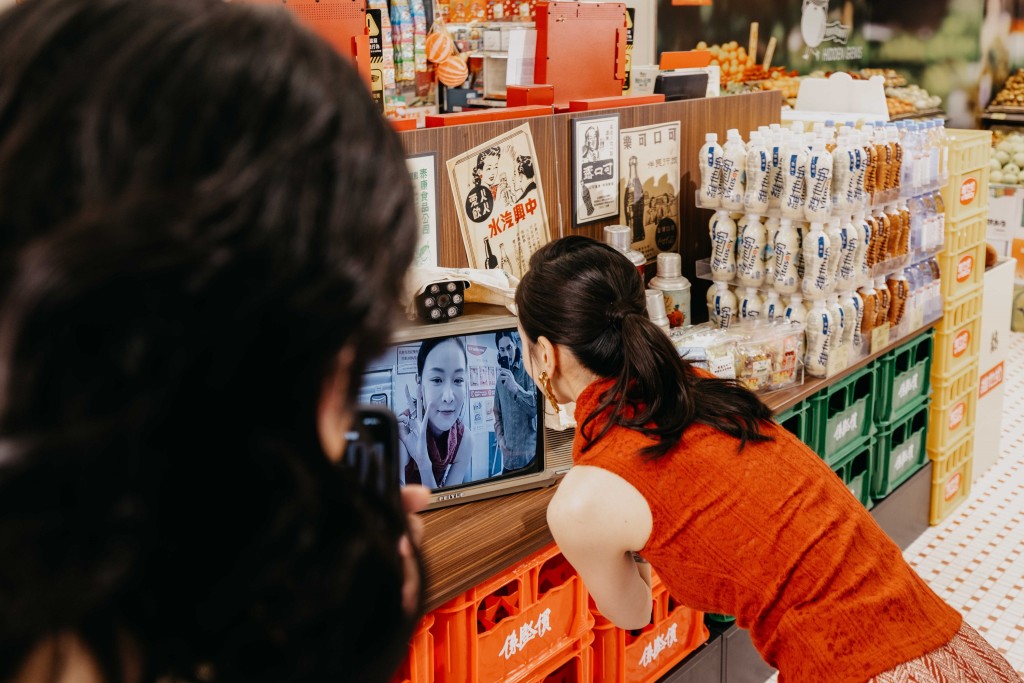 The storefront features LED signage modeled after old Hong Kong neon lights, along with mirrored tiles reminiscent of traditional shopfronts. Inside, shoppers pass through a classic silver-and-green turnstile before entering what the company describes as a “time tunnel,” complete with red plastic lamps, a retro television display, an old-style telephone installation, vintage grocery scenes and traditional street signs.
