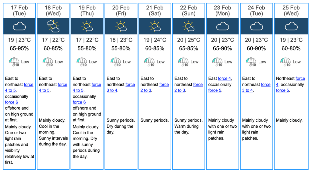 Sunny intervals are forecast for the second and third days of the Lunar New Year, with cool mornings followed by warmer daytime conditions in the following couple of days. The monsoon is expected to moderate later in the week, bringing generally warm daytime conditions with periods of sunshine over the weekend.