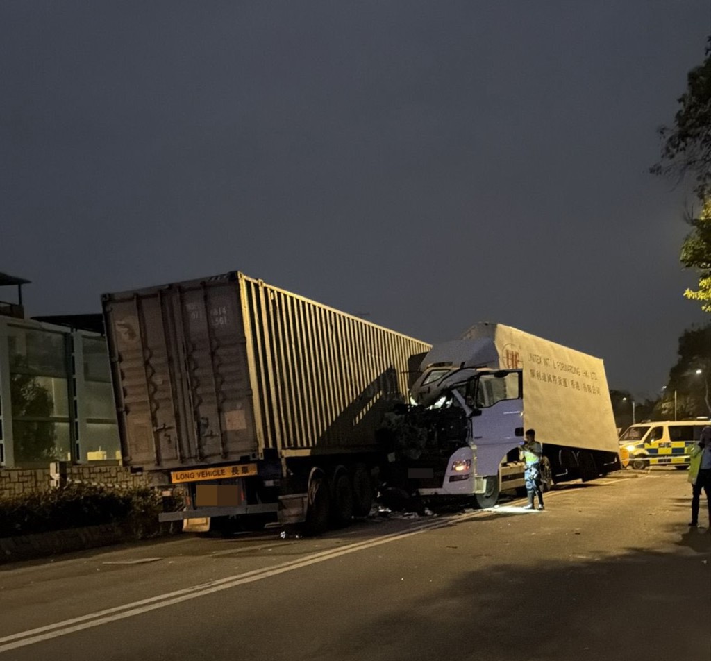 The serious accident occurred at around 5am on Ping Ha Road. A medium goods vehicle traveling toward Yuen Long was suspected of losing control near Lo Uk Tsuen, crossing into the opposite lane after hitting a traffic island and colliding head-on with an oncoming tractor unit.