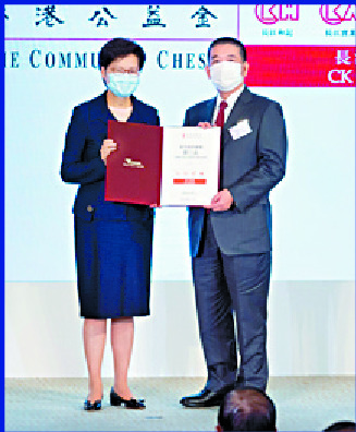 Simon Man Ka-keung, general manager of the accounts department at CK Asset Holdings, accepted the award on behalf of CK Group from Chief Executive Carrie Lam Cheng Yuet-ngor yesterday.