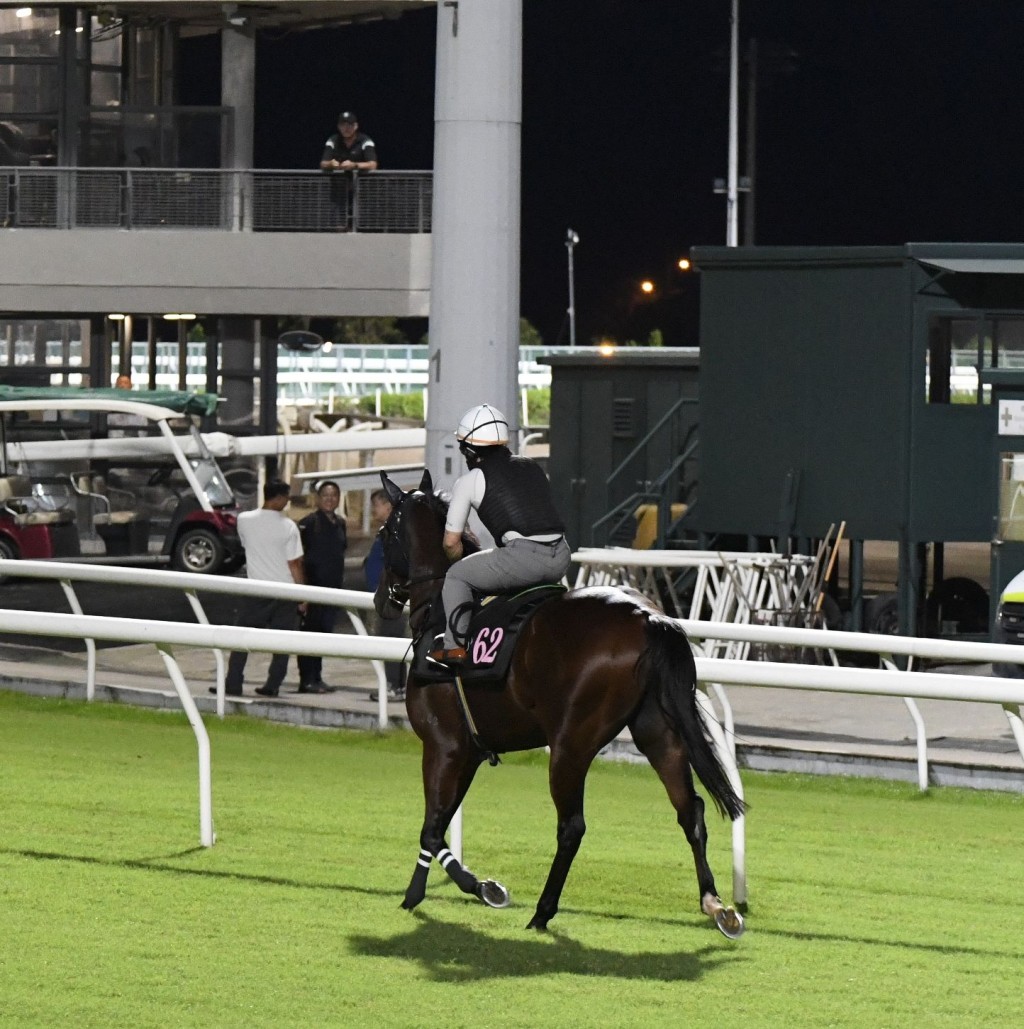 At 3:43 a.m., under lights on the course proper at Sha Tin, Ka Ying Rising left the quarantine stables and cantered down the 1,000-meter chute before gradually quickening through the back straight and sprinting home over the last 400 meters in 23.6 seconds with a trackwork rider aboard.