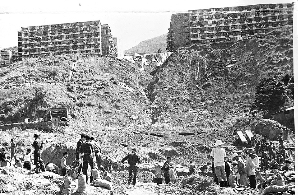 Lady MacLehose, wife of the then governor, visits the site of the Sau Mau Ping landslide in 1972.