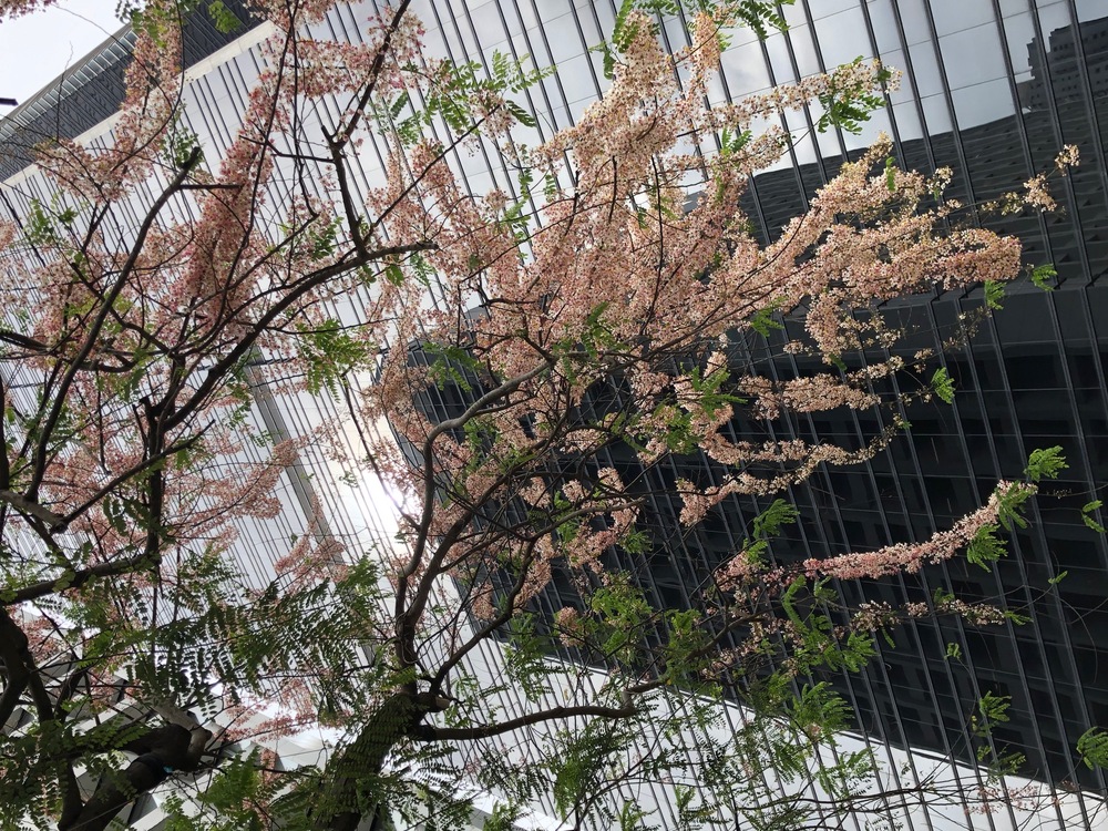 Cassia javanica, also known as pink shower or rainbow shower, has flowers on its slender branches. Some of them drift to the ground as branches sway in the wind.