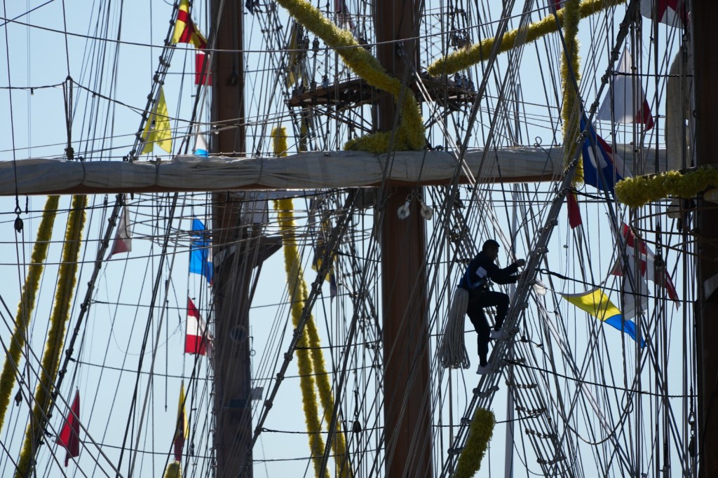 It is normal that when this type of vessel enters or leaves a port in a city, crew members stand on the yards – the beams where the sails are hung – “dressed” along with hundreds of bright lights dangling on the various parts of the masts, to wave farewell to onlookers on the quayside. For this ship, the front mast carries five yards, capable of carrying 12 crew members on the lowest yard and four on the top yard. Cadets climbed up the masts through the rope shrouds and, for safety reasons, were securely harnessed.