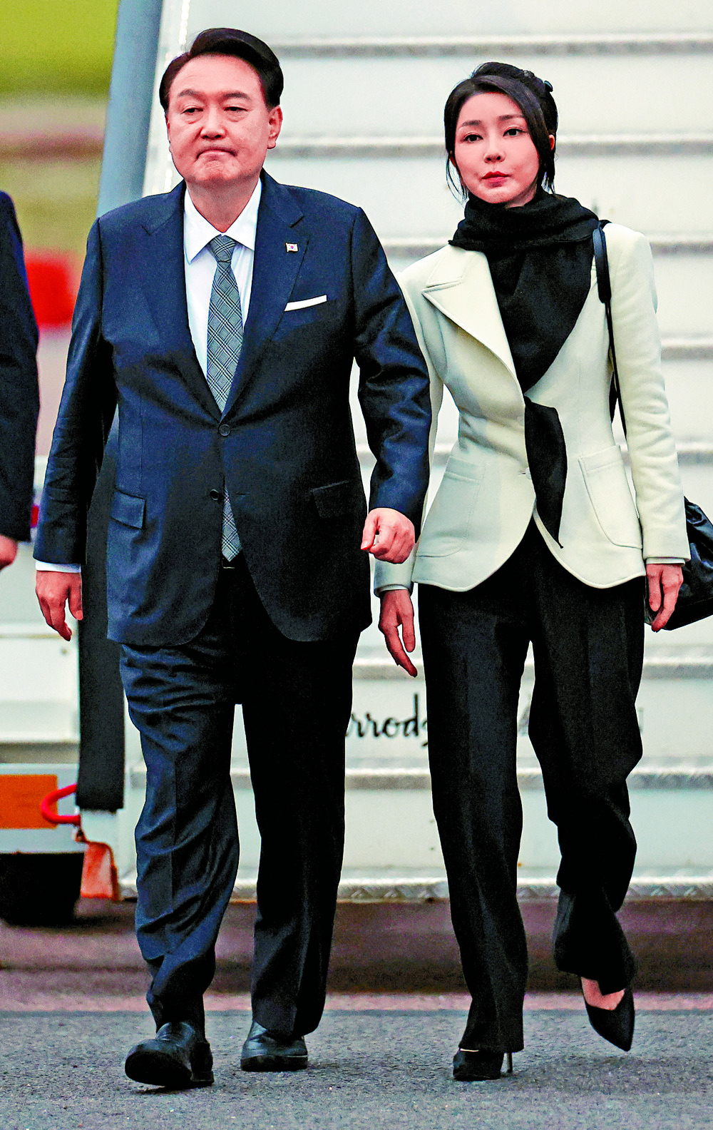 Young South Koreans hang out with friends in the popular upscale district of Gangnam in Seoul. Far left: President Yoon Suk Yeol and his wife Kim Keon Hee have not been outstanding models of parenthood for the young. AFP, REUTERS