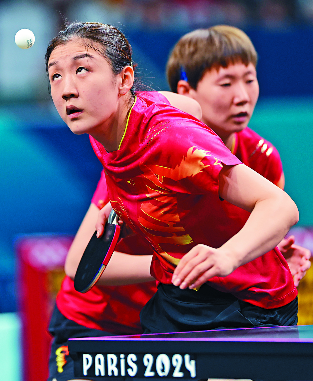 The game is on with, clockwise from left, Japan's Miu Hirano seeming to be transfixed by the ball as she serves to South Korea's Shin Yubin at the Paris Olympics; Fan Zhendong, wielding a shakehand grip, using the red rubber side of his bat to go for