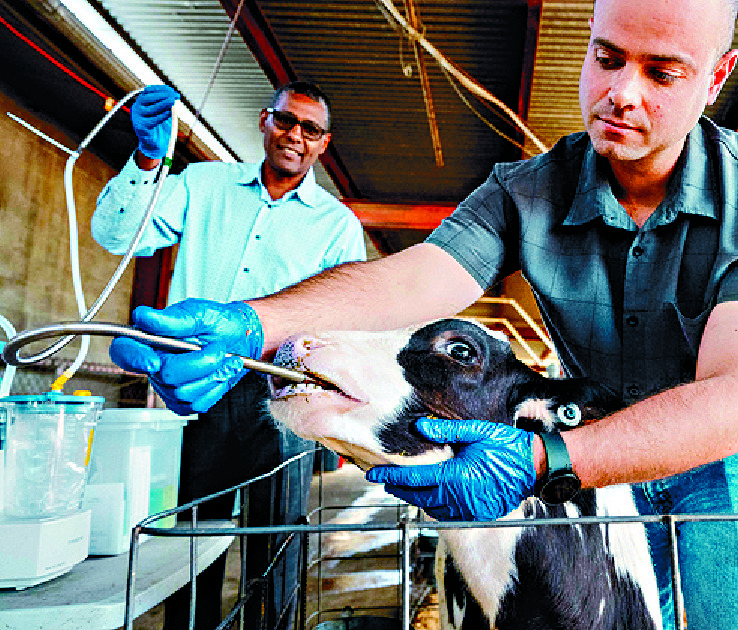 A scientist guides a tube into the mouth and down to the stomach of a two-month-old calf as part of a research project aiming to prevent cows from burping methane.