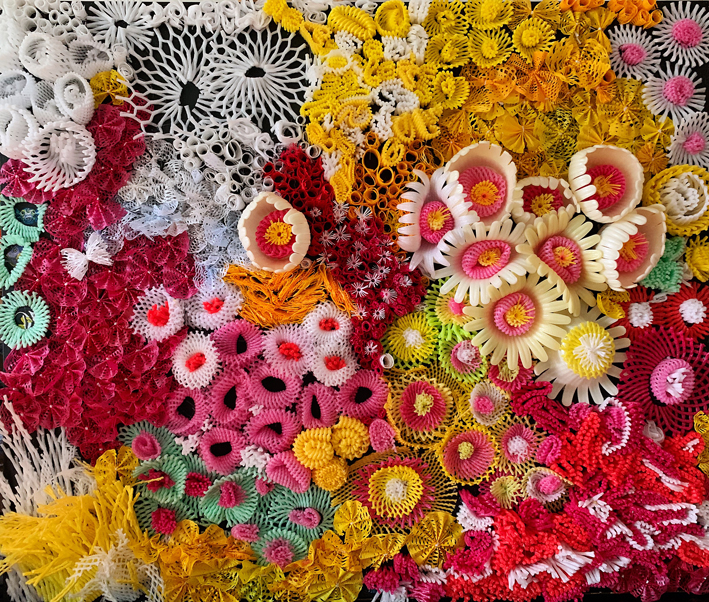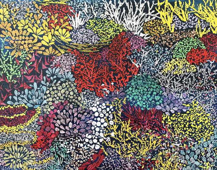 Her most recent multimedia work Coral incorporates paintings of tropical fish into a collage of foam nets, normally used to pack fruits and vegetables, arranged as a coral reef.