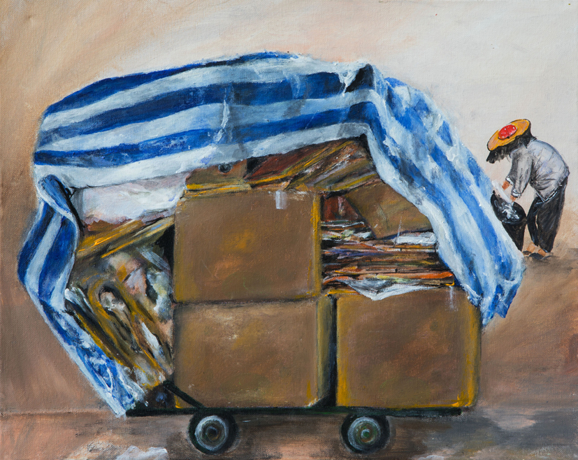 One of Pang's personal favorite is her acrylic painting, She is a real artist - Cleaning Lady, in which she depicts a scene common to Hong Kong: an elderly cardboard collector.