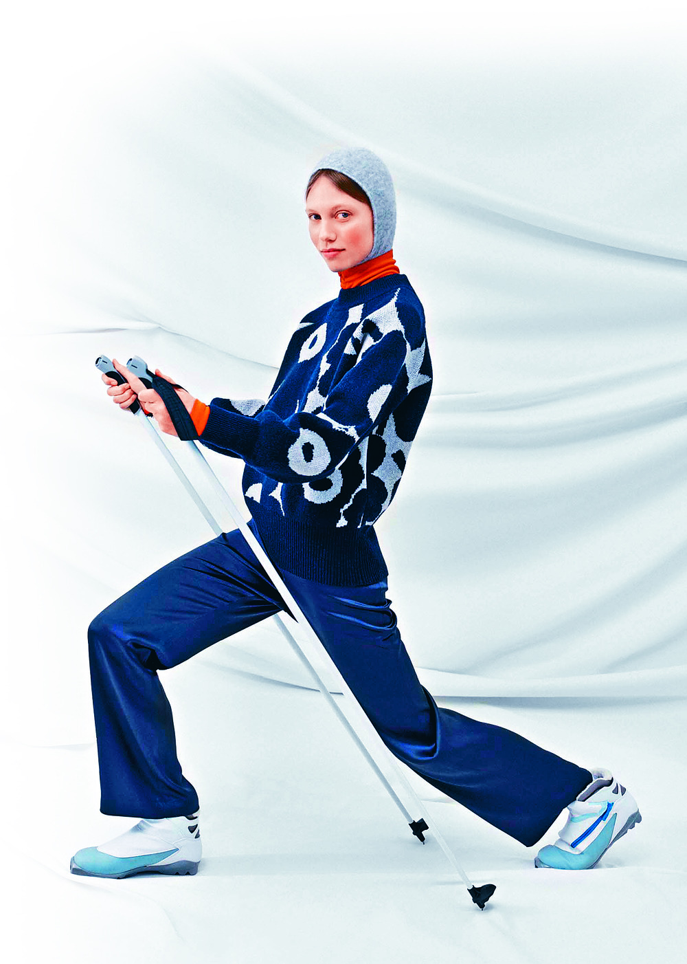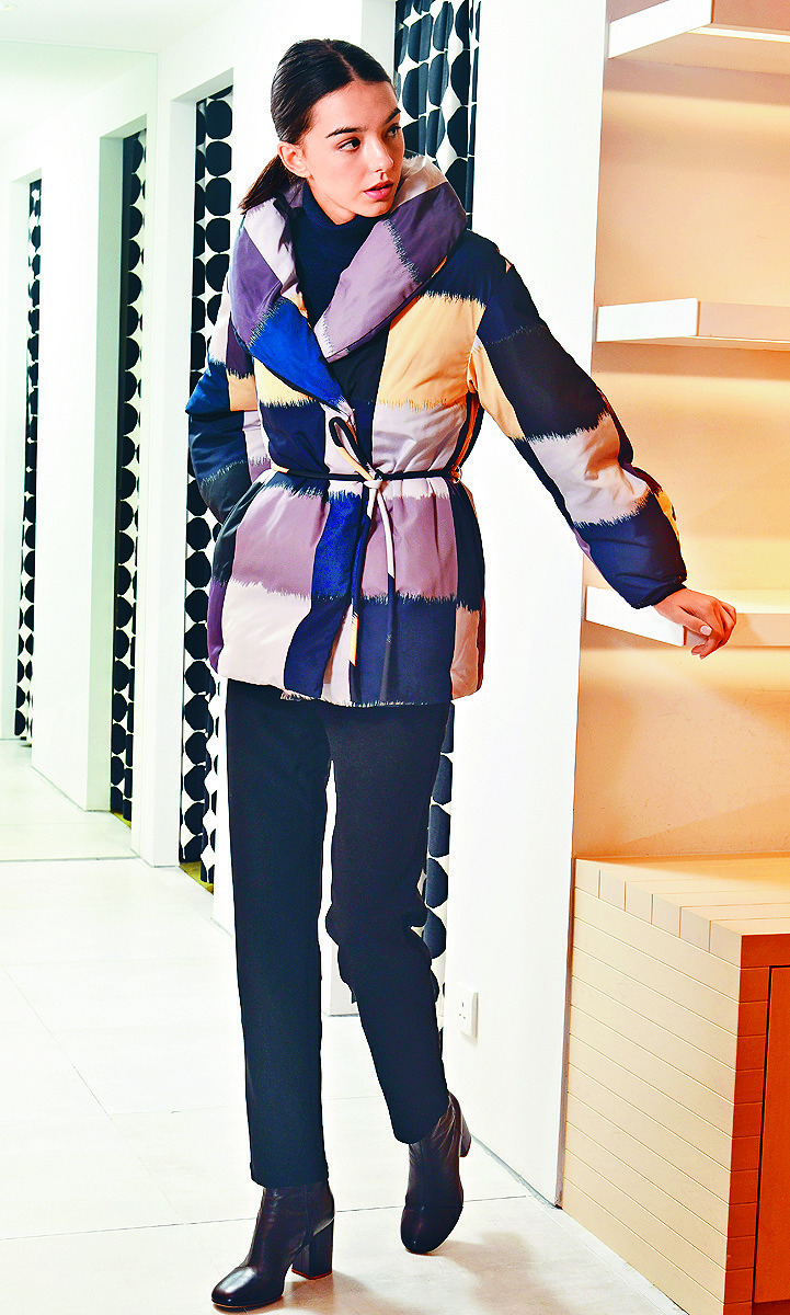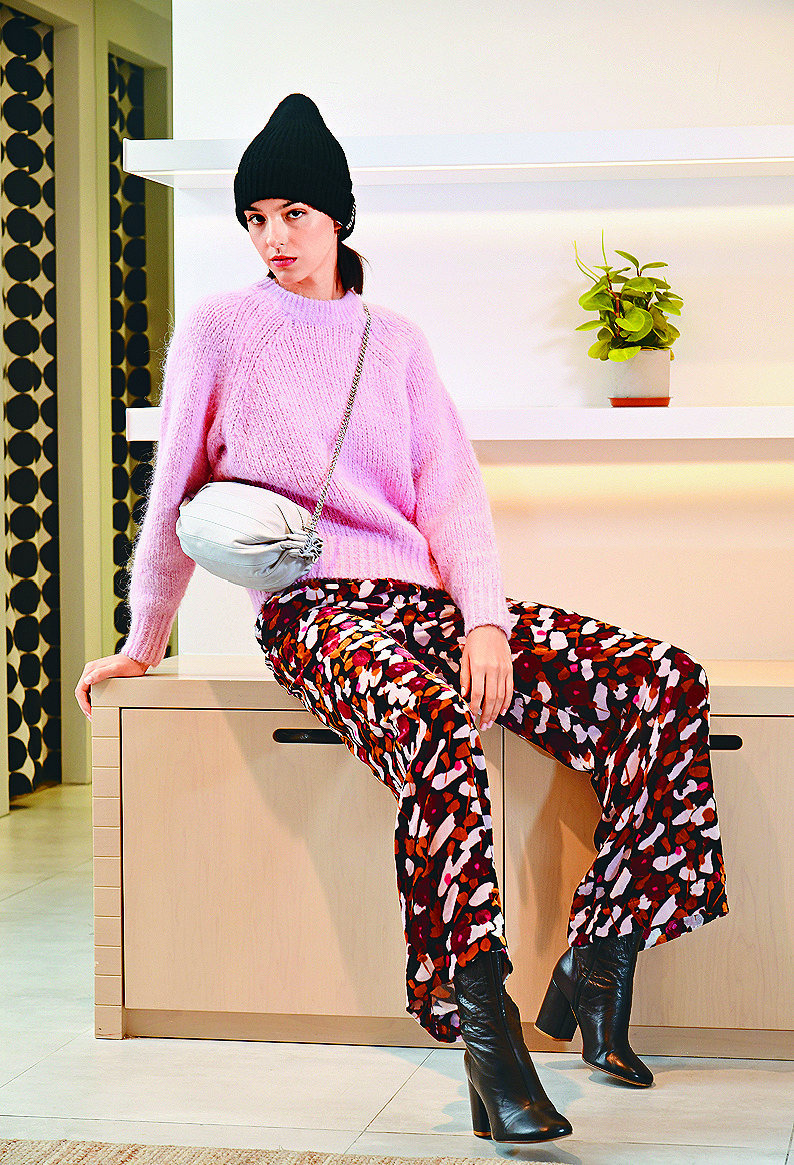 The opulent Ostjakki checks remain in the collection this season and are seen on new silhouettes such as the silk dress, knitted pullover and padded coat. The fashion house's classic print, the Unikko poppy, blooms on tops.